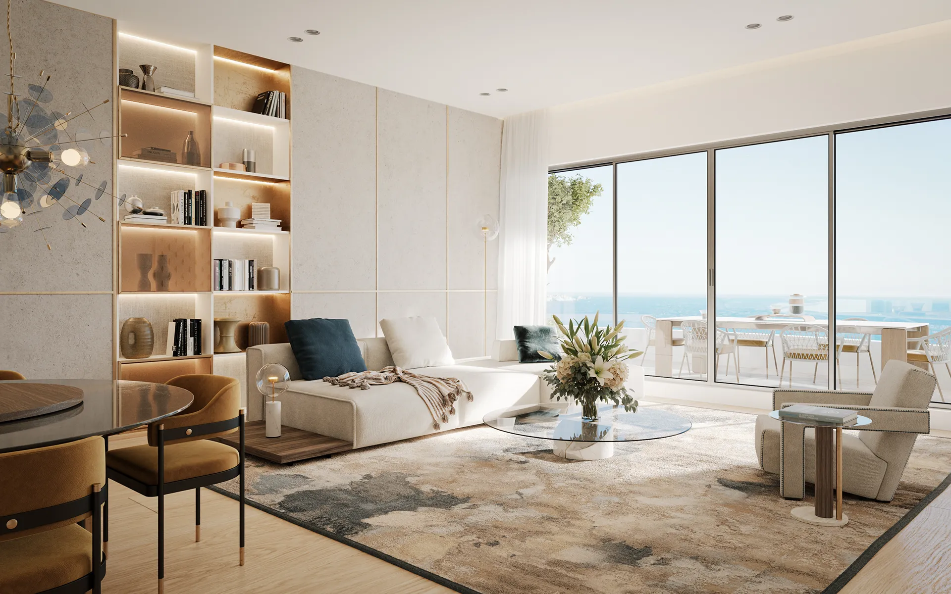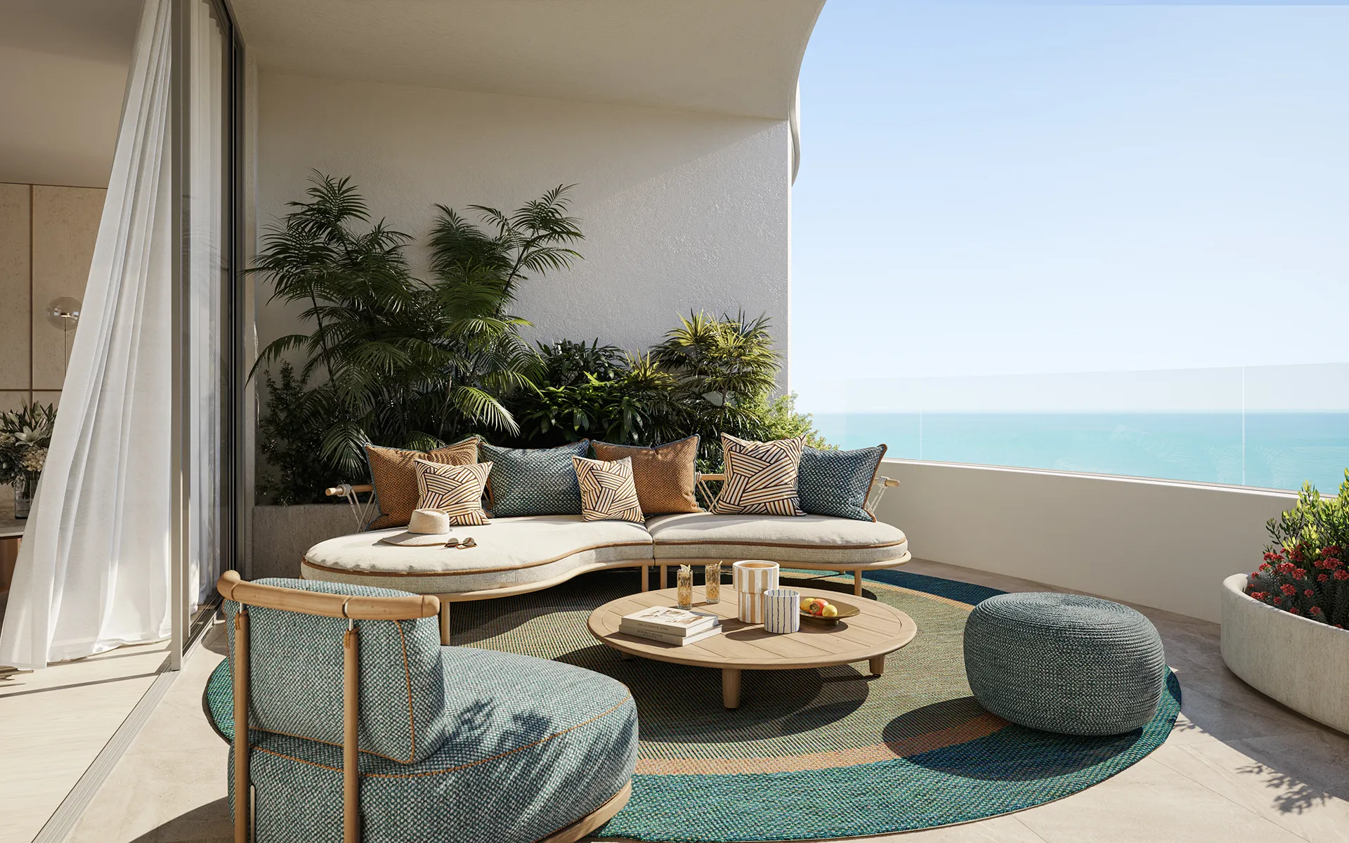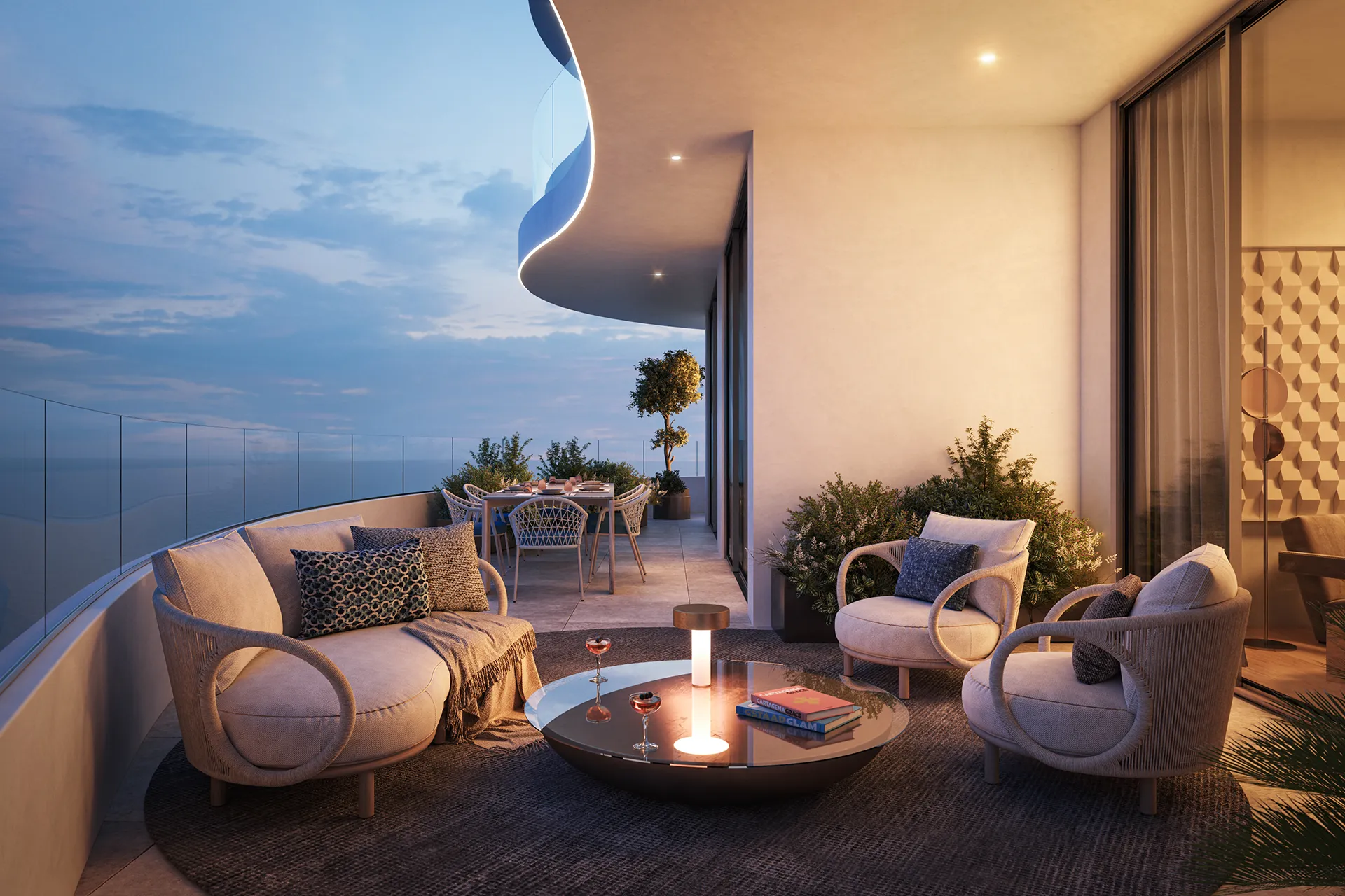 Miraggio’s design embodies the essence of fluidity and soft movement. Its cascading terraces and curved balconies seamlessly integrate with the surrounding nature that flows through it. The building forms a sculptural masterpiece, offering breathtaking ocean views and private, verdant outdoor spaces, where reflections dance on glass and stone.